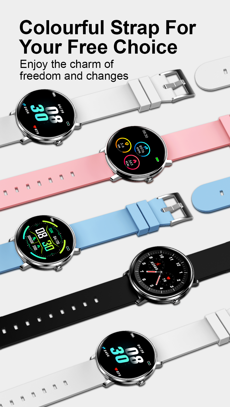 Typical functions : Heart rate monitoring,Blood pressure monitoring,Blood oxygen Time and date display, step, calorie, distance counting ,